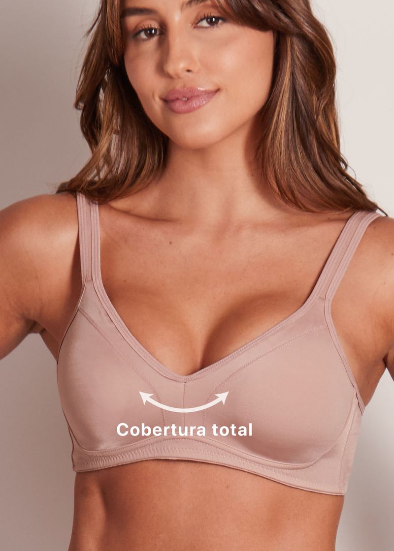 Sutiã sem aro e sem bojo, mas busto com anatomia moldada, forrado em fio LYCRA® de toque suave e costura reforçada no decote.
