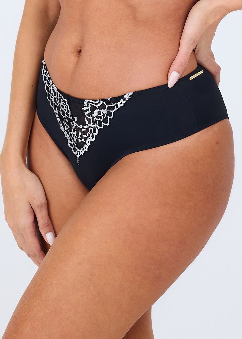 Calcinha Biquíni toda adornada em renda bicolor, com forro na circunferência da cintura, proporcionando menos transparência na região, adicionando um toque de feminilidade e charme.