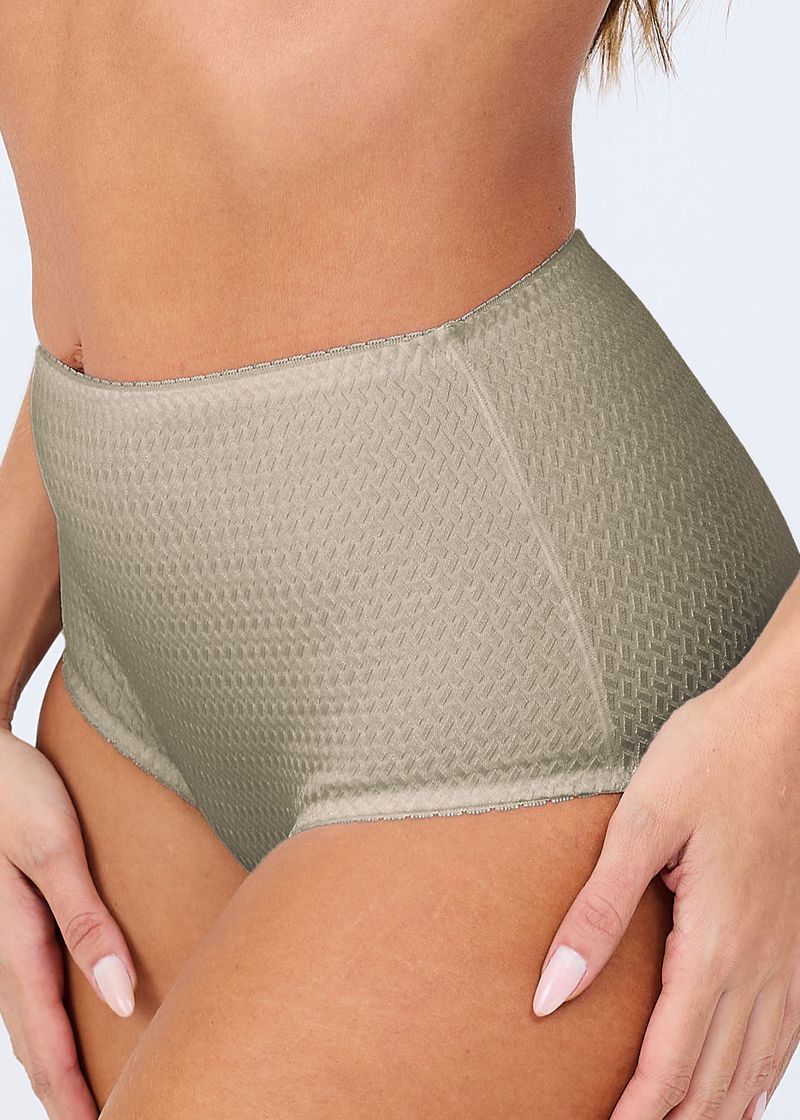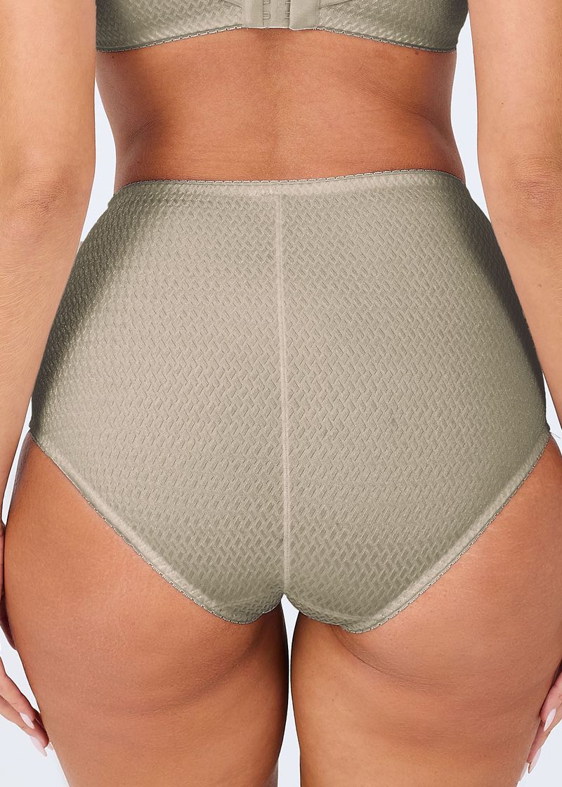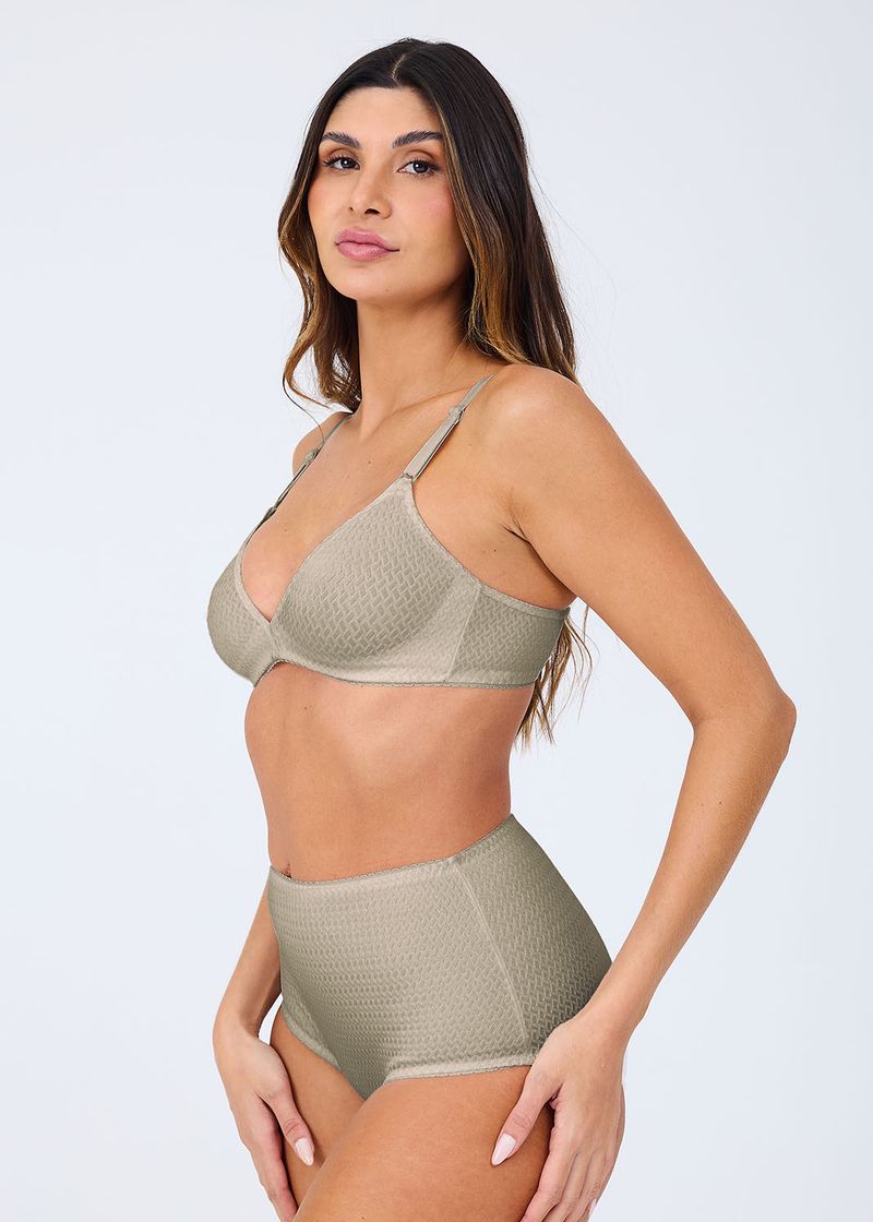 Calcinha de modelagem básica, cintura alta, laterais largas e pernas com cavas baixas.