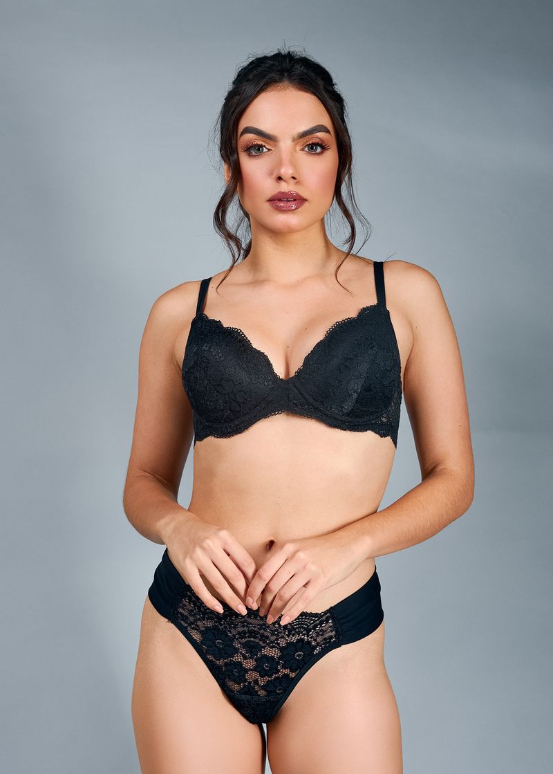 Conjunto Sutiã Meia Taça Com Bojo E Aro Todo Em Renda e Calcinha Tanga Fio Frente E Costas Em Renda Com Laterais Em Microfibra Brenda PRETO