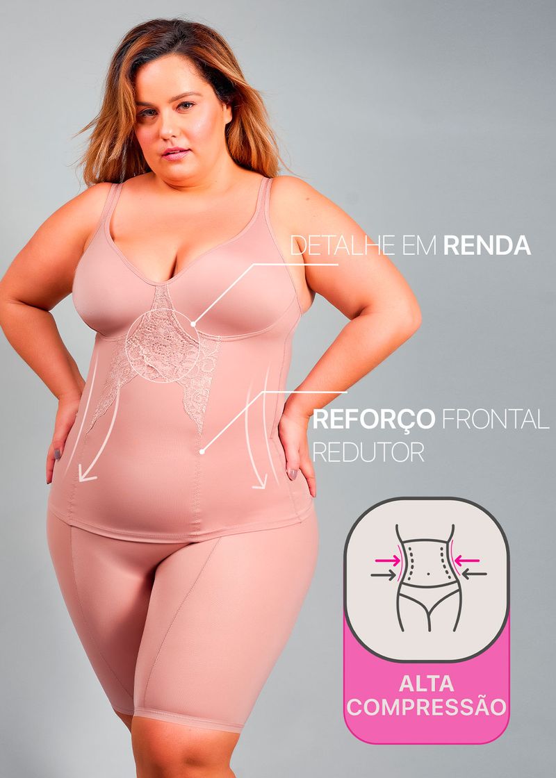 A camisete modeladora é confeccionada em poliamida, possui alta compressão e modelada de forma a esconder as gordurinhas.