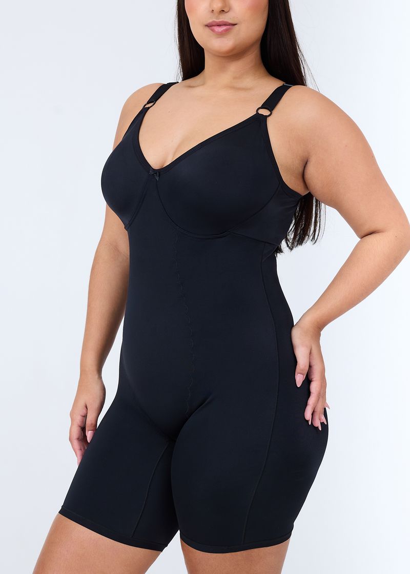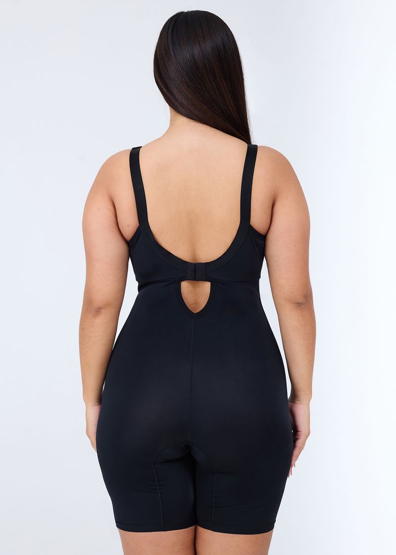 Modelador Macaquinho Média Compressão sem Bojo Plus Size possui abertura inferior e tecido de média compressão com duplo reforço frontal no abdômen.