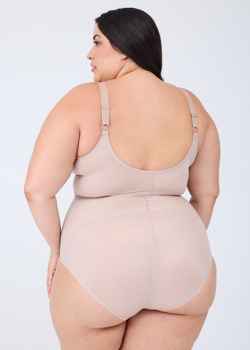 O Modelador Plus Size Com Bojo Moldado possui tecido de ALTA compressão, busto moldado, cavas com duplo tecido que não dobra, costas em U e laterais altas, com fecho inferior com 2 regulagens sobreposto ao tecido.