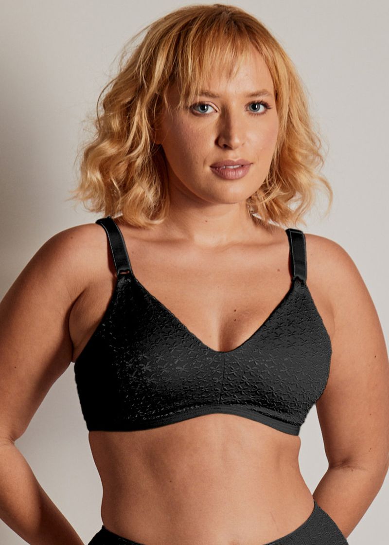 Sutiã cobertura total sem aro e sem bojo, mas busto confeccionado em duplo tecido de média compressão.