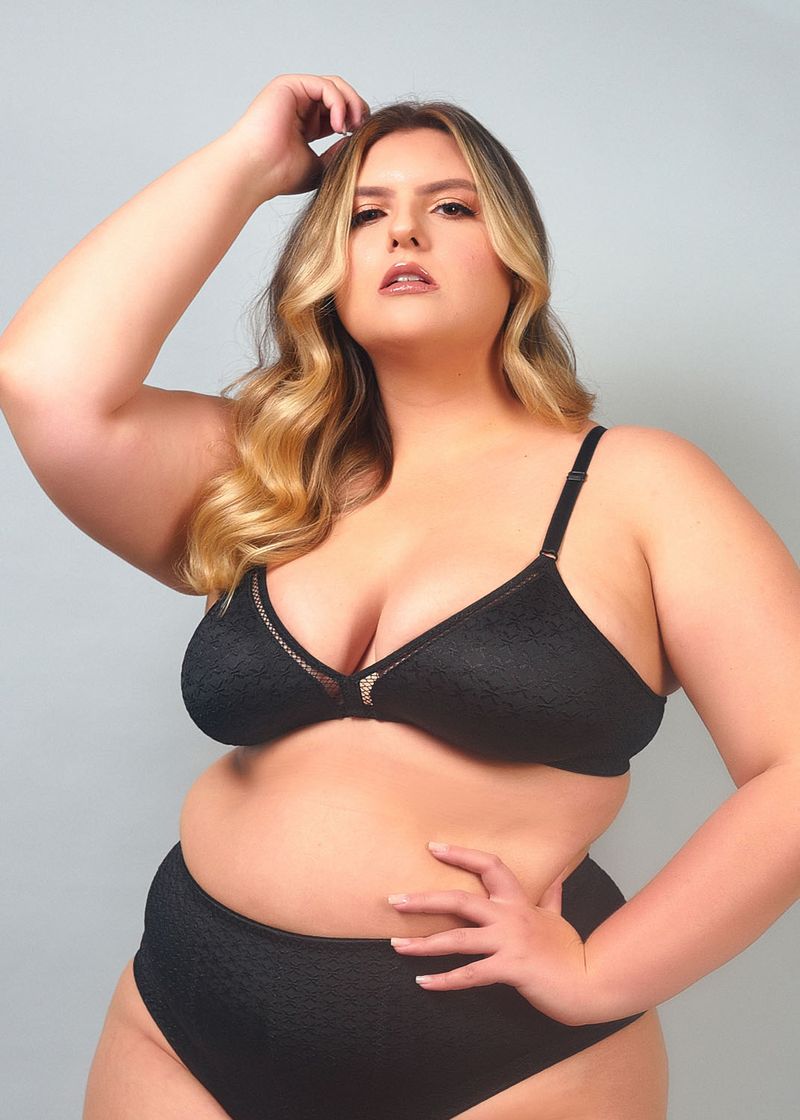 Sutia tradicional sem bojo estruturado e aro, mas busto moldado anatomicamente e reforçado na base inferior.