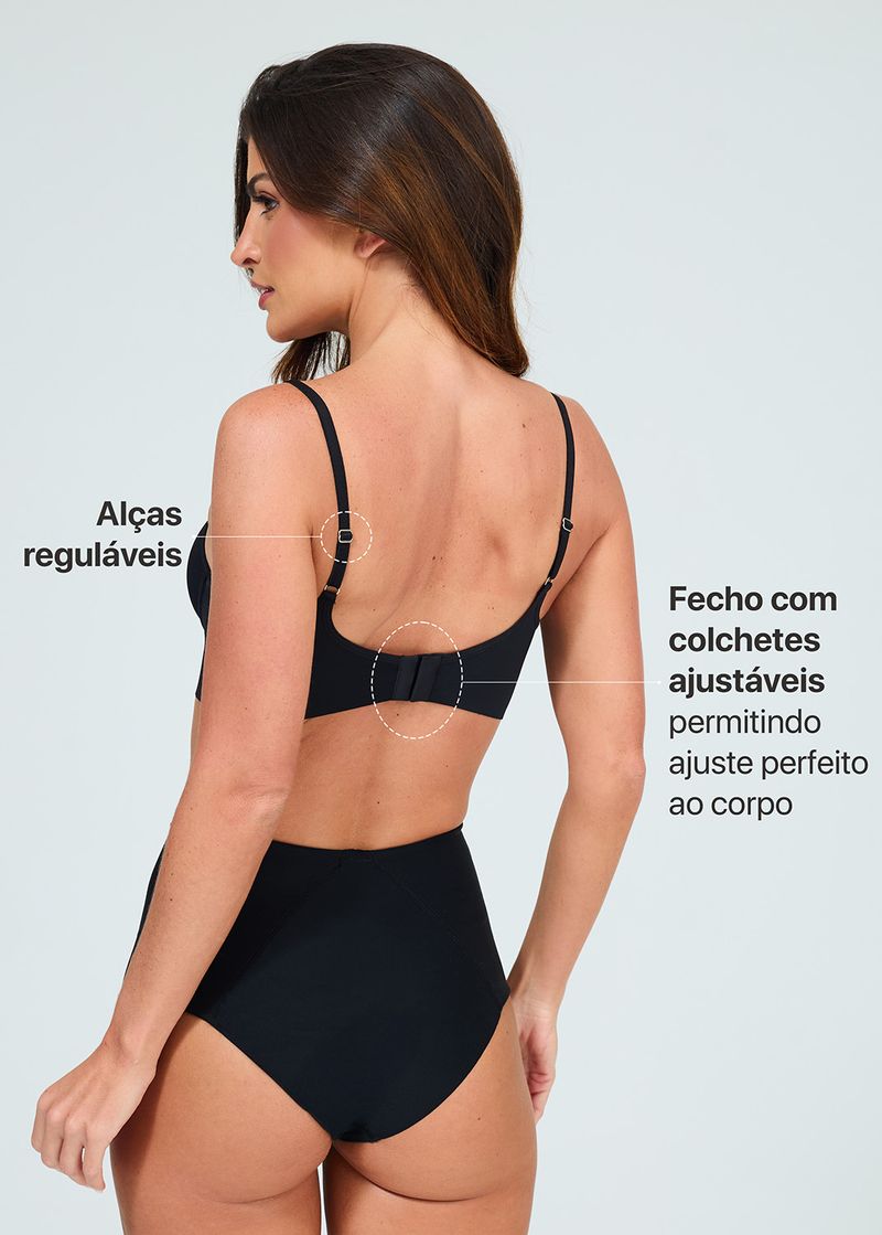 Possui bojo estruturado que valoriza o busto, além de alças reguláveis e fecho com colchetes ajustáveis nas costas, permitindo ajuste personalizado ao corpo.